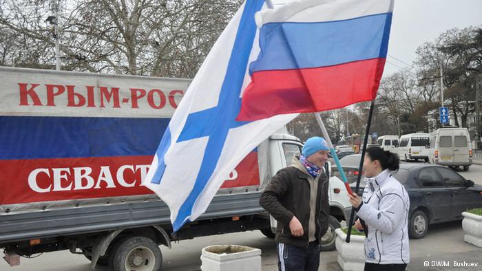 Muitos manifestantes traziam a fita de São George – um símbolo de bravura militar, sobretudo para os russos, e lembrança de sua vitória sobre os nazistas. Entre 1941 e 1942 ocorreu no porto de Sevastopol uma das batalhas mais difíceis na Segunda Guerra Mundial. Atualmente, é lá que a frota russa no Mar Negro se encontra estacionada.